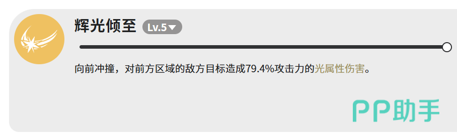 第二技能【辉光倾至】同样在5级激活,目绒兔向前发起短距冲撞,对路径前方扇形区域内的敌人造成79.4%攻击力的光属性伤害。作为缓冲定位角色,该倍率在同类型单位中处于上游水平,兼顾功能性与基础压制力,尤其适用于多目标聚怪场景,操作流畅度与覆盖率表现均衡。