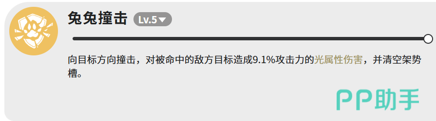 终阶技能【兔兔撞击】在5级释放时,对命中目标造成9.1%攻击力的光属性伤害。尽管基础数值偏低,但其核心战略意义在于强制清空目标架势槽。该机制直接干预敌方行动节奏,在高难度副本、Boss机制应对及控场需求强烈的关卡中,往往比单纯伤害更具不可替代性。