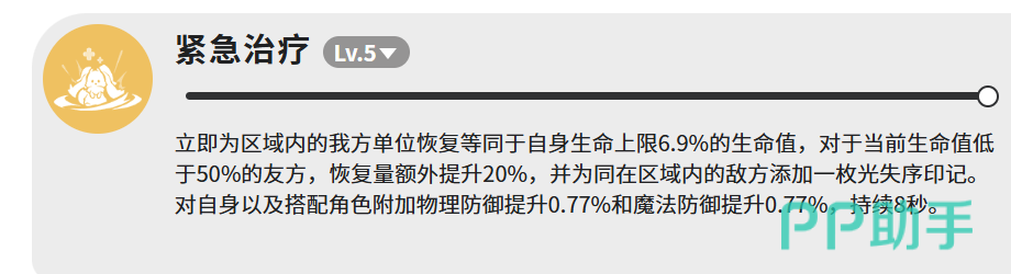 其核心技能【紧急治疗】于5级解锁,可对范围内所有友方单位即时恢复相当于自身最大生命值6.9%的生命值。该效果具备智能响应机制:当目标当前生命值低于50%时,治疗量额外提升20%,显著强化危急时刻的生存保障能力。此外,该技能同步在范围敌方单位身上施加一枚“光失序印记”,为后续协同输出提供策略接口;同时为自身及编队内指定角色提供持续8秒的双防增益——物理防御与魔法防御各提升0.77%(基于基础数值叠加),在中后期持久战中构成稳定减伤支撑。