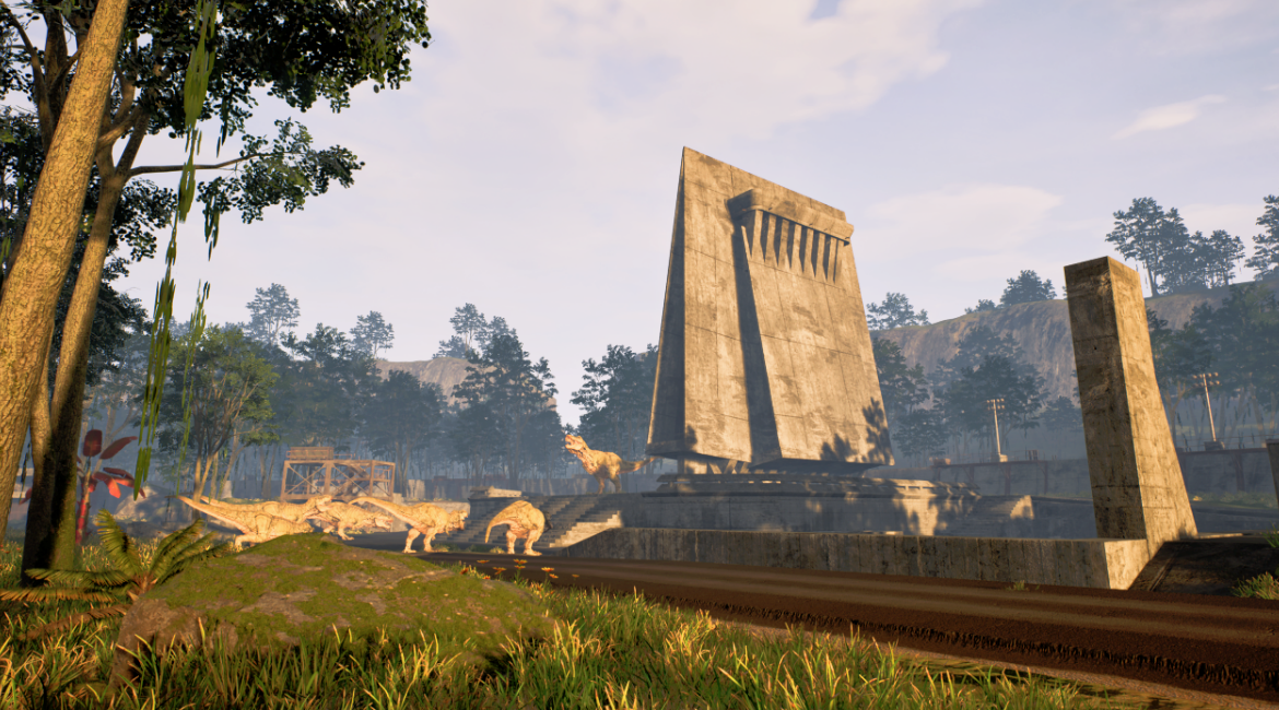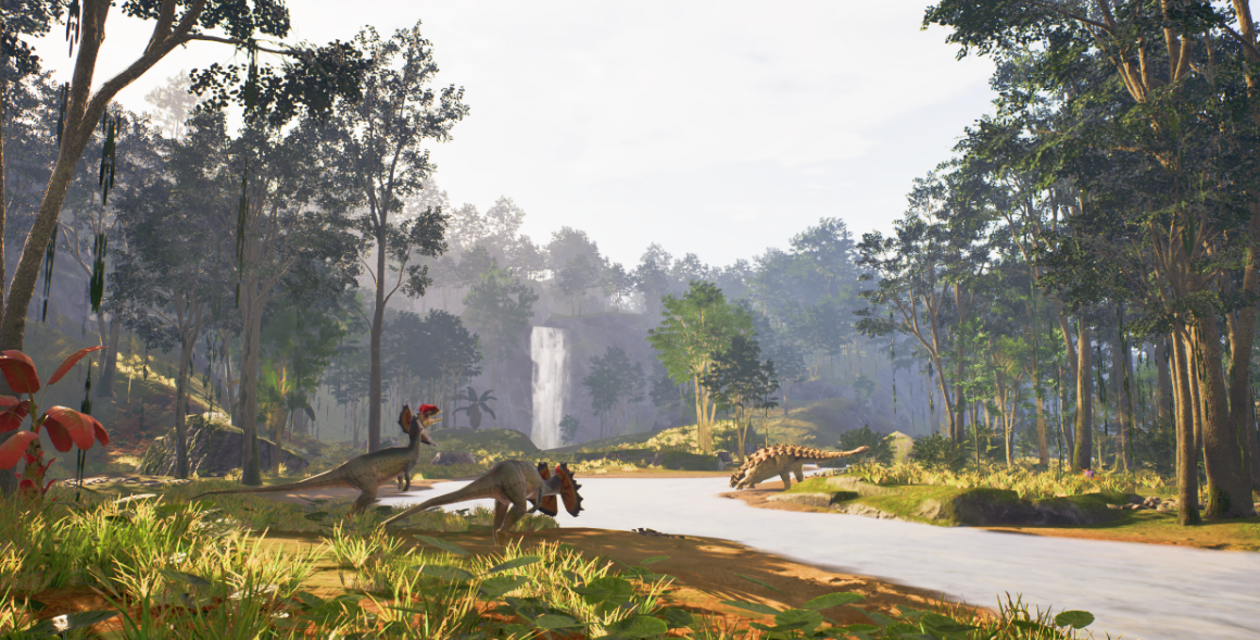 视觉表现采用写实向3D引擎构建,场景渲染强调物理可信度:林区呈现动态光斑穿透与叶面次表面散射,沙漠区域通过热畸变粒子模拟空气扰动,雪域则以环境色温衰减与积雪物理堆积强化沉浸感。恐龙模型基于古生物学研究设定比例与关节运动范围,奔跑、伏击、进食等动作序列均经过生物力学校验,杜绝机械式重复动画。