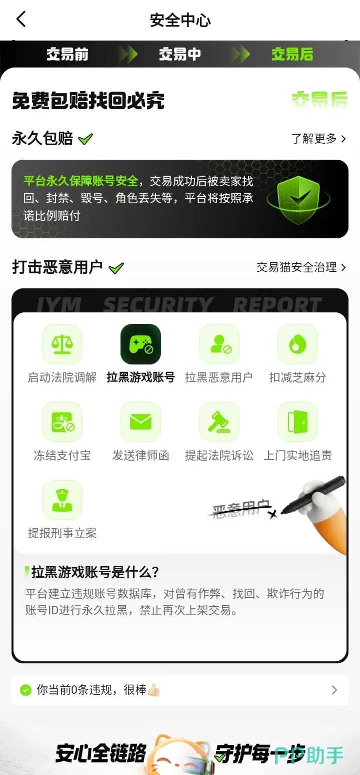 区别于普通中介型平台,交易猫构建了贯穿交易全周期的安全体系:支持充值代充、陪练代打等延伸服务;对买卖双方实行身份证+人脸识别双重实名绑定;首创“全链路安全报告”,实时同步账号状态、操作日志与过户进度;并行业首发“永久包赔”保障机制——涵盖验号失误、过户失败、账号异常回收等全部风险情形,实现真正的一站式闭环服务。