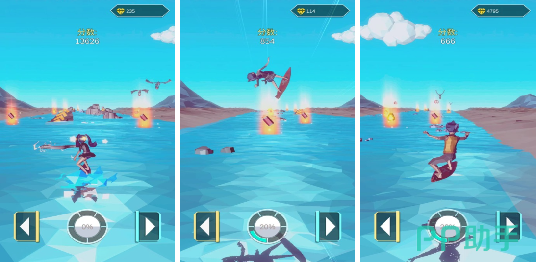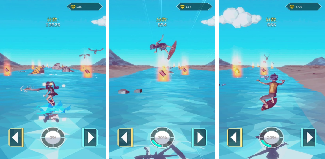 喷射冲浪采用第三人称追尾视角,强调高速移动下的环境感知与微操精度。仅保留“跳跃”与“喷射推进”两个核心按键,通过长按/短按组合触发不同动作模式。浪花音效经专业水下录音采样,配合震动反馈模块,强化临场沉浸感。地图中散落能量晶体、护盾充能站与临时加速带,资源分布遵循风险回报平衡原则,鼓励玩家探索非主路径获取优势。