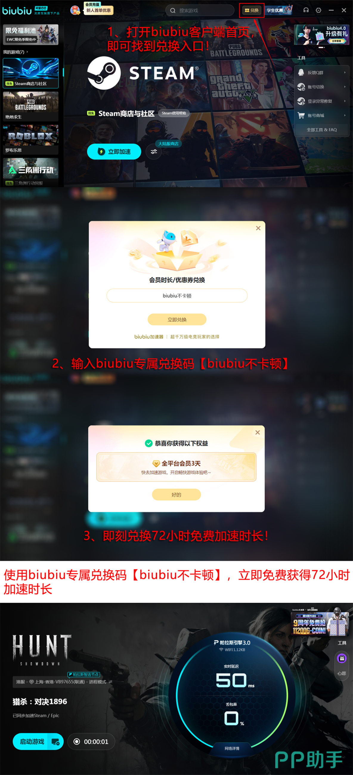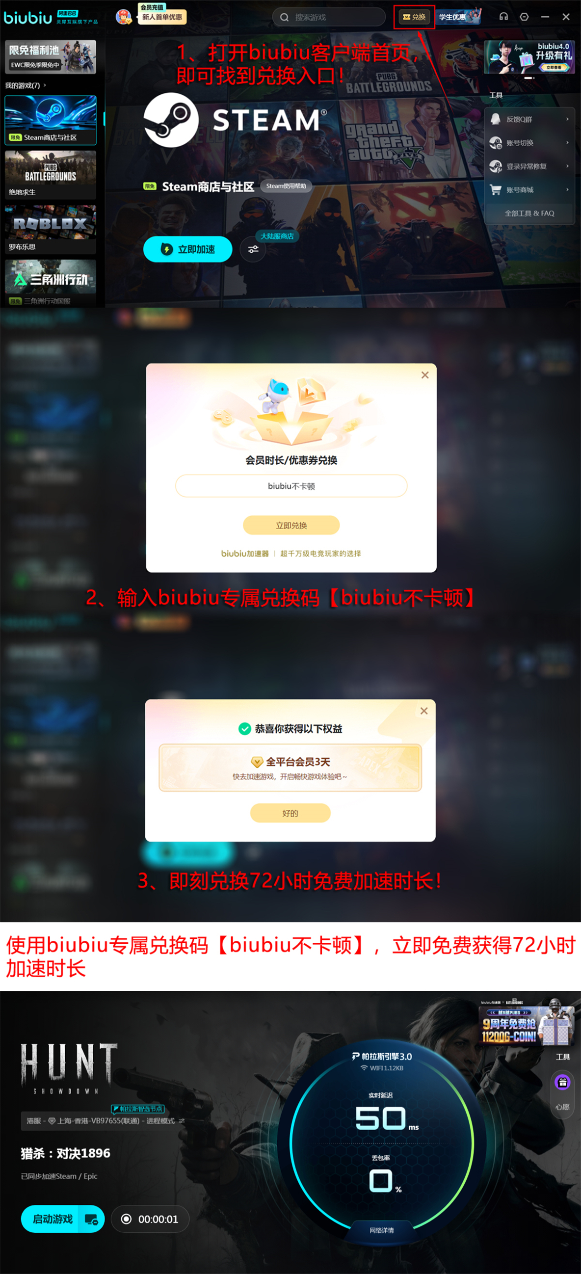 功能体验方面,biubiu提供零门槛试用机制:新注册账号可享24小时全功能免费加速;另可通过输入兑换码【biubiu不卡顿】额外获得72小时授权时长,合计可达96小时深度体验期。后续订阅方案按日均成本计算不足1元,适配长期稳定使用需求。