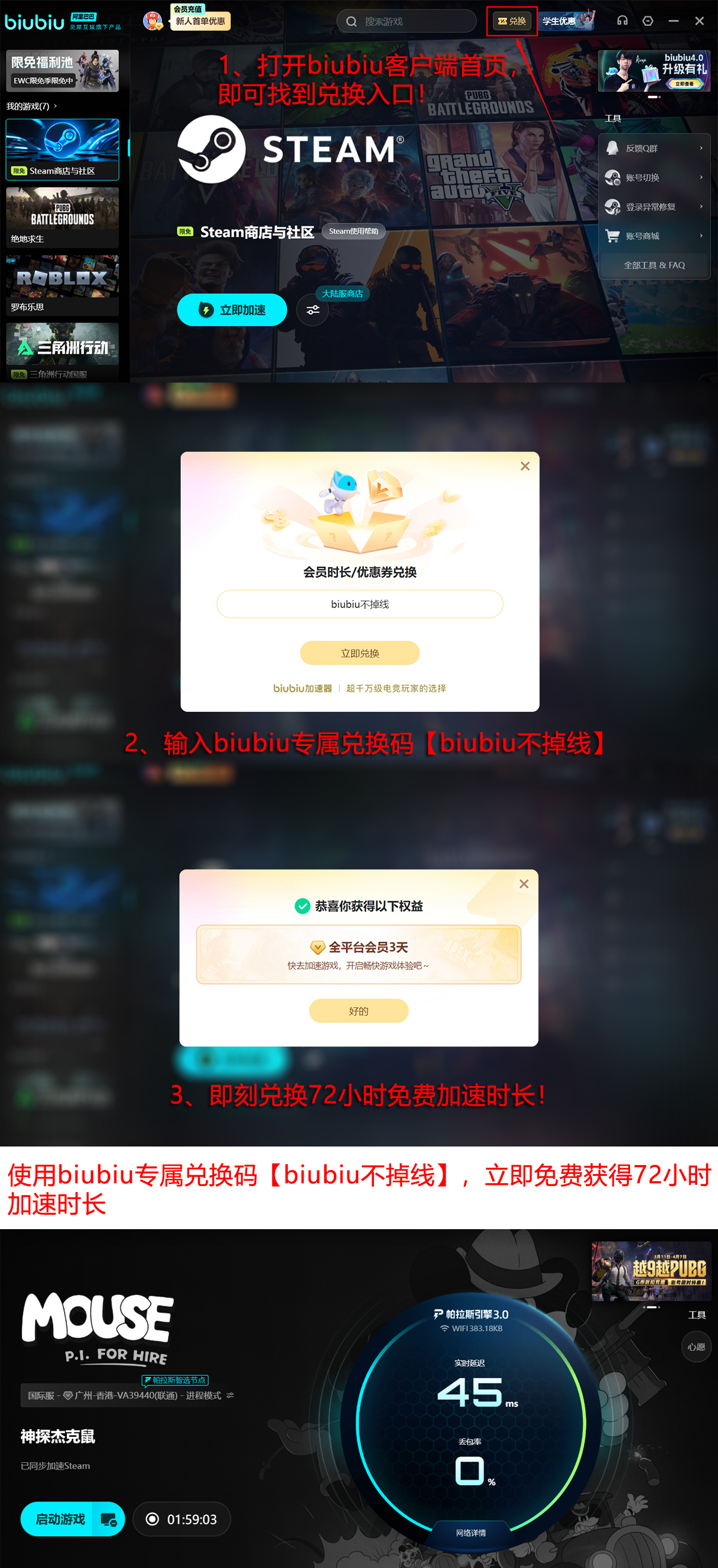 在用户权益方面,该加速器提供切实可用的新手激励政策:完成注册并登录后,即可自动获得24小时免费加速时长;再输入专属兑换码【biubiu不掉线】,还可额外领取72小时加速服务。两项叠加,新用户总计可享96小时无门槛使用权限,后续亦持续开放更多进阶福利通道。