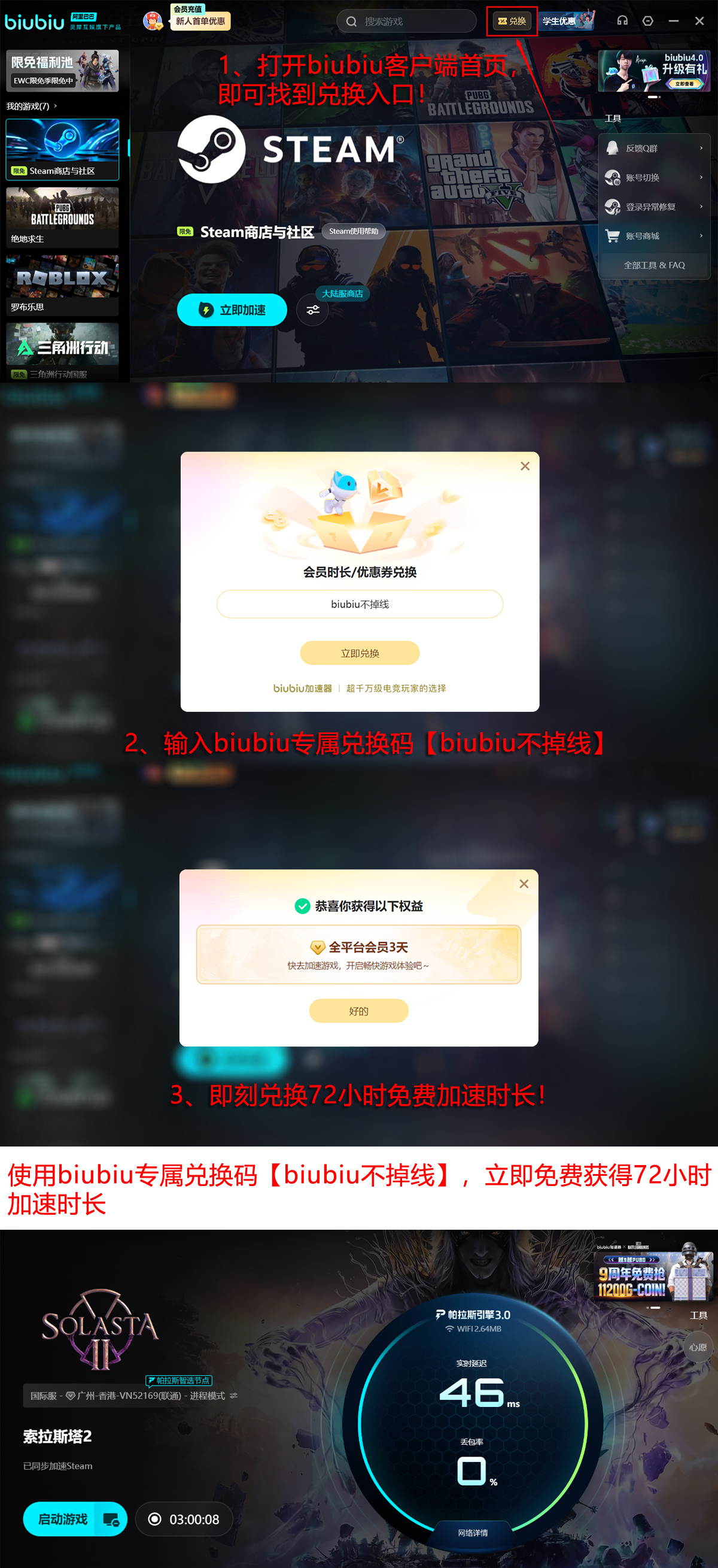 新用户注册即可领取「新人加速大礼包」:首日免费使用biubiu加速服务24小时;叠加口令【biubiu不掉线】还可额外获赠72小时加速时长,总计达96小时。全程无需订阅、无隐藏扣费,切实保障新手期完整体验。