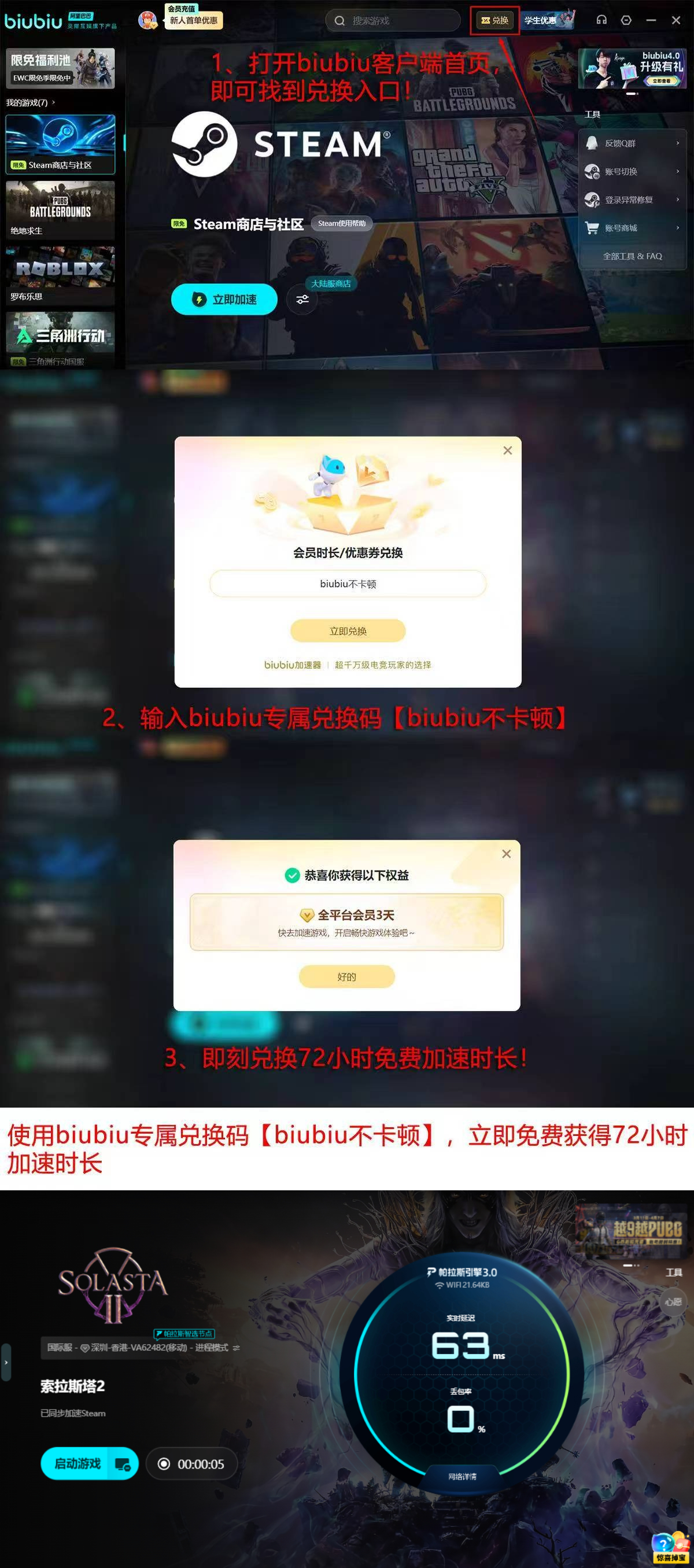 面向首次使用的用户,biubiu加速器提供完整功能的新手体验权益:注册账号后即可激活首日24小时全权限试用;在激活界面输入专属口令【biubiu不卡顿】,还可额外获得72小时加速服务延展,累计享有超96小时无限制使用周期,零门槛验证产品实效性。