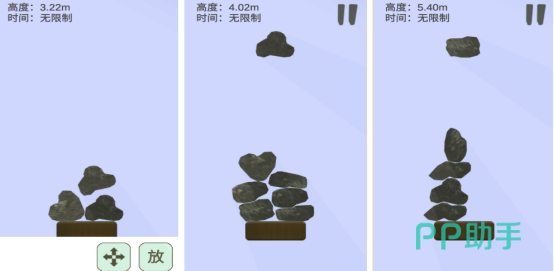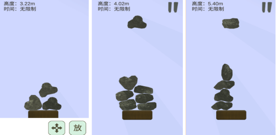 采用极简视觉风格,聚焦不同几何形态的石块组合。玩法融合物理引擎特性,核心机制为精准堆叠:每一块石头都需通过旋转、微调位置实现结构稳定,目标是搭建高度突破4米,并在90秒内保持整体不坍塌,达成挑战条件。