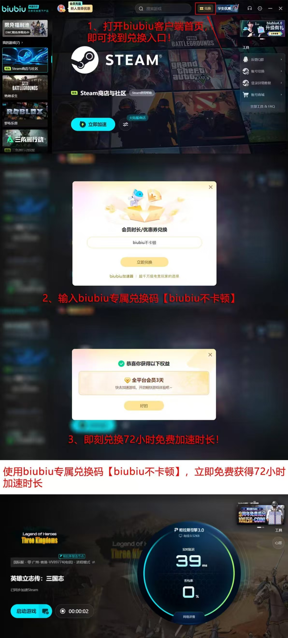 新用户注册biubiu加速器即可获得24小时全功能免费试用权限。输入专属兑换码【biubiu不卡顿】,可额外激活72小时加速服务。合计96小时无限制加速周期,覆盖新手引导、赛季首战及跨服协作等核心场景,彻底解决主界面冻结、操作指令延迟反馈、匹配中断等典型故障。