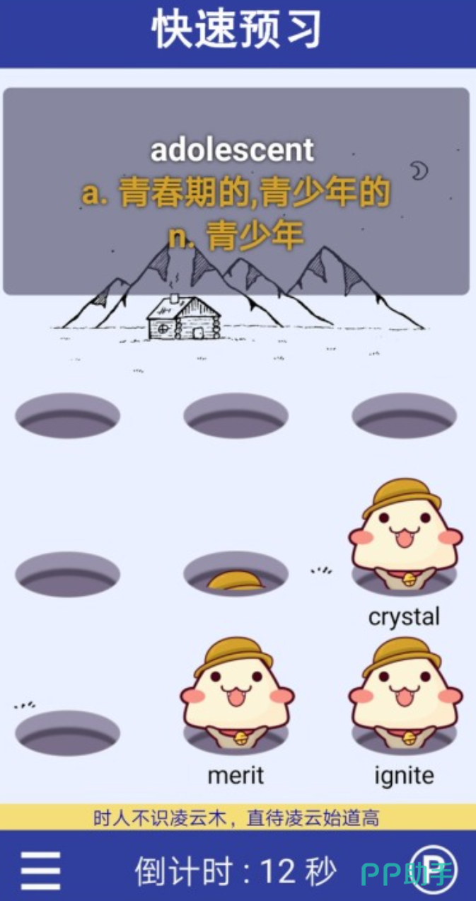 融合RPG战斗机制与词汇测试,玩家需在限定时间内从多个选项中选出目标单词的准确中文释义。答对触发角色攻击,答错则损失生命值。游戏进度与词汇掌握程度强绑定:掌握的基础词越多,解锁的技能越丰富,通关效率越高。词库横跨中考、高考、四六级至考研核心词汇,并嵌入常用词根词缀解析模块,助力构词逻辑理解。