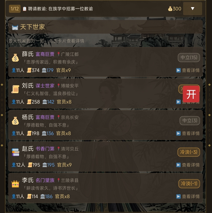 除了通过提升家族硬件和进行家族成员的培养外,构建关系网为家族保驾护航自然也是游戏的核心之一。玩家们可通过与其他家族打好关系,利用这些家族的资源来帮助自己的家族实现腾飞,也能通过联姻等方式,来与其他家族组成更密切的同盟,甚至还能直接与皇帝、太子等重要角色打好关系,为家族寻找一个靠山,好令家族在发展过程中不会受到太多的阻碍。