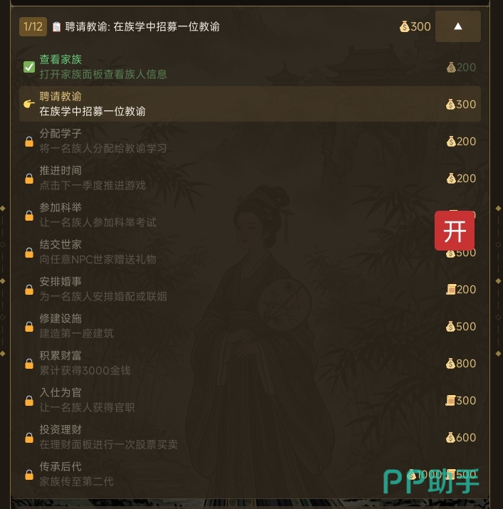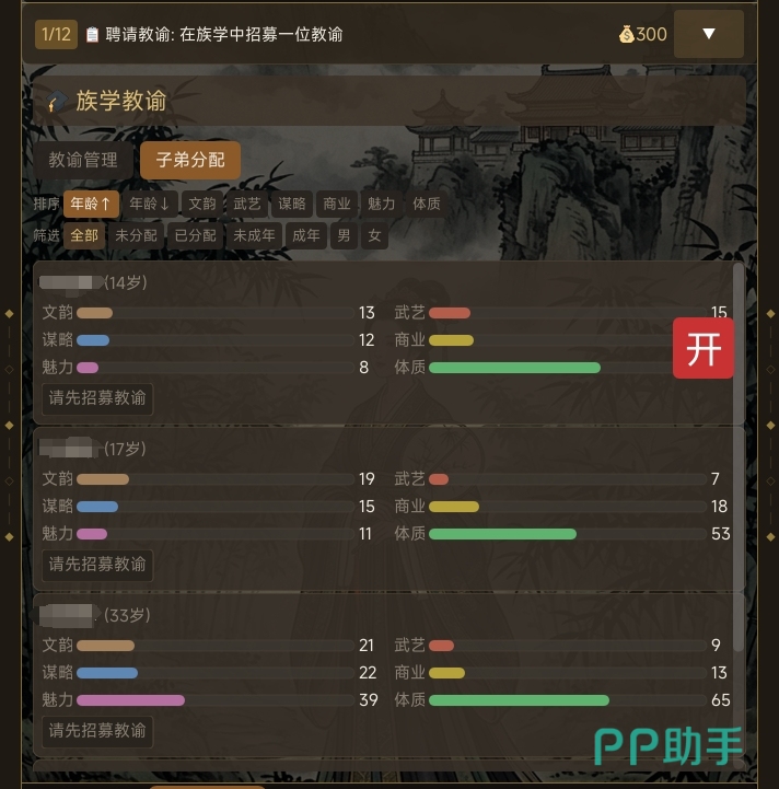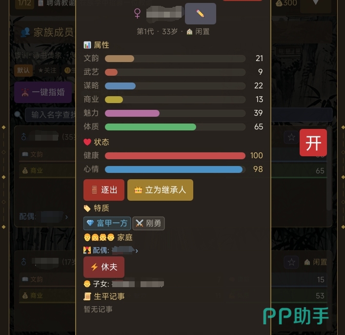 游戏有着非常全面的家族成员培养机制,每位家族成员都可通过进入书院、武场等家族建筑,来提高他们各方面的能力,并且玩家还通过升级家族建筑,提升家族建筑对家族成员的增益,好令各成员能更快成长。玩家们还能通过查看各家族成员的信息,来了解他们的天赋和所擅长的领域,并以此作为基础,帮助他们确定自己的人生目标,在各自的优势领域里发光发热,并为家族的发展作出更多贡献。