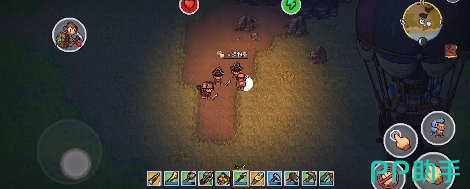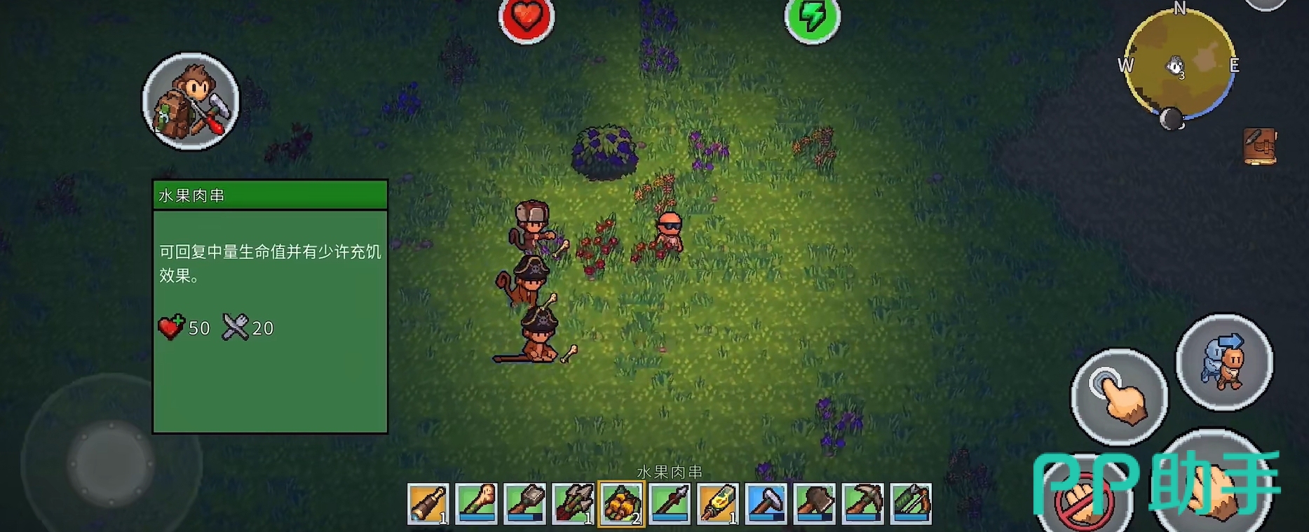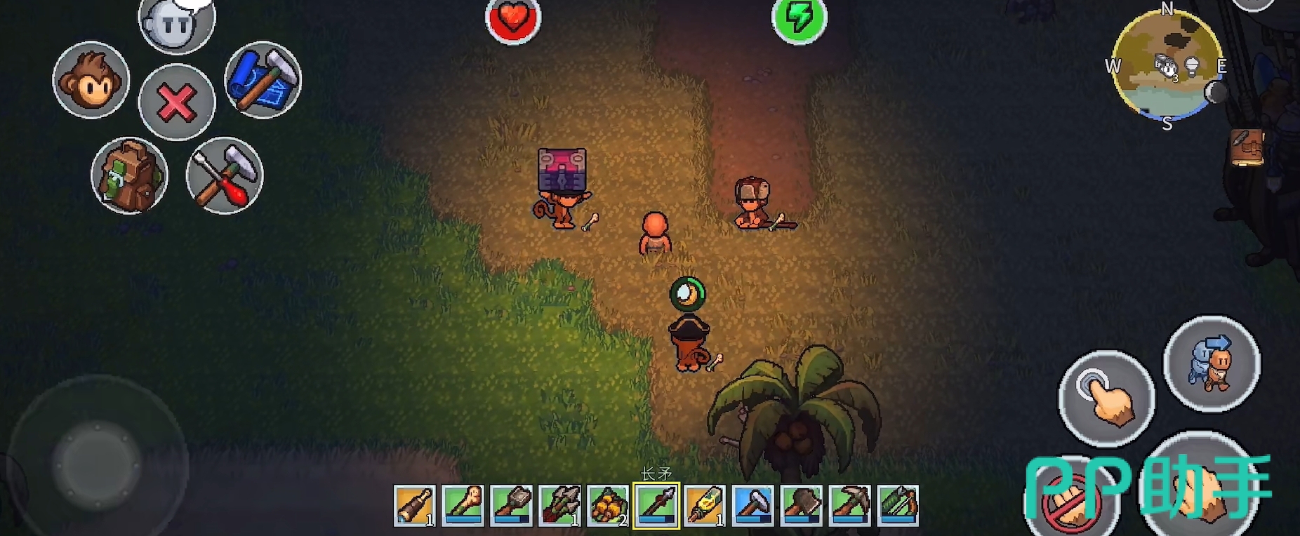 夜间生态是本作的重要张力来源。当暮色降临,岛屿深处会浮现具有攻击性的敌对生物,玩家需提前准备火把、武器与防具方可应对。值得注意的是,游戏中存在独特的“灵猴协作系统”:解救被囚禁于藤蔓笼中的野生猴子后,它们将主动追随玩家,并自动复刻基础动作——如挥斧伐木、挥镐挖矿、拾取材料等;更可通过制作专属护甲与短矛提升其防御与输出能力,在遭遇战中承担前排牵制角色,形成人宠协同的战术组合。