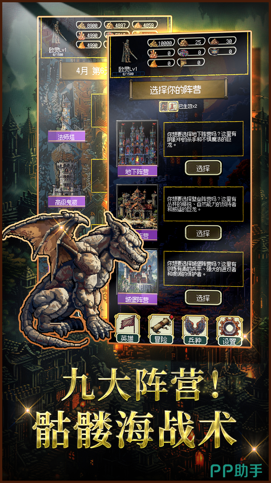 这款游戏就算挂机也可以来操作,帮助自己获得收益,并且成长的乐趣都是非常高的,游戏中加入了阵营的玩法,一共有9大特色的阵营,可以自由的选择发展的路线,并且还有骷髅的战术,可以打造独特的规模压制,帮助自己更好的钻研,游戏中还有主城建造以及资源管理等等,包括兵种招募以及魔法学习等等内容,可以在大地图当中来探索。