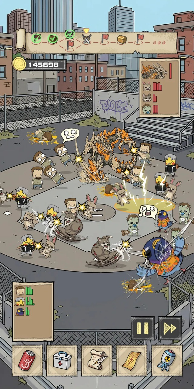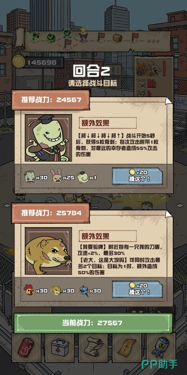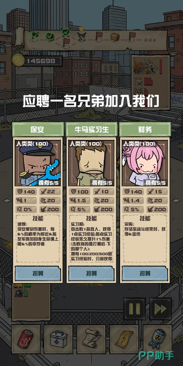 游戏别看在题材上使用了世界末日和丧尸这类当前比较常见的题材,可是游戏中的故事内容设定却是十分的新颖,而且游戏中还加入了很多不同的内容,比如说在招募玩法中,玩家可以招募到外形各不相同的角色,每一个角色在设定上都有着亮点的敌方,比如说顶级牛马、、保安、财务等等,这个有着不同定位的角色和僵尸战斗时都有着不一样的技能,保安的技能就是在自己受到伤害的时候,有概率给友军施加自身生命值的上线。