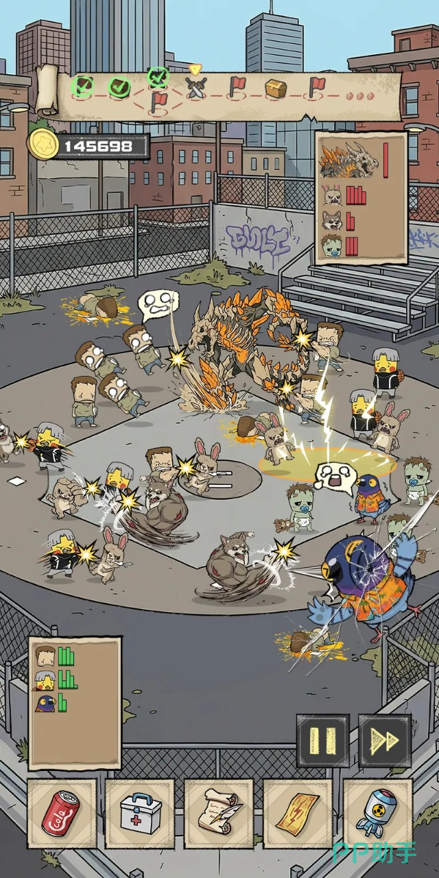 战斗的时候还提供各种道具可以使用,比如说可乐、医药箱、符纸以及炸弹等等,这些道具在使用以后都会产生不同的效果,让我方和僵尸战斗时的压力大幅度的降低,武器装备作为抵抗僵尸的主要武力值来源,玩家可以一边抵抗僵尸一边用杀僵尸获得的金币去购买适合的圣器,打造最强套路。