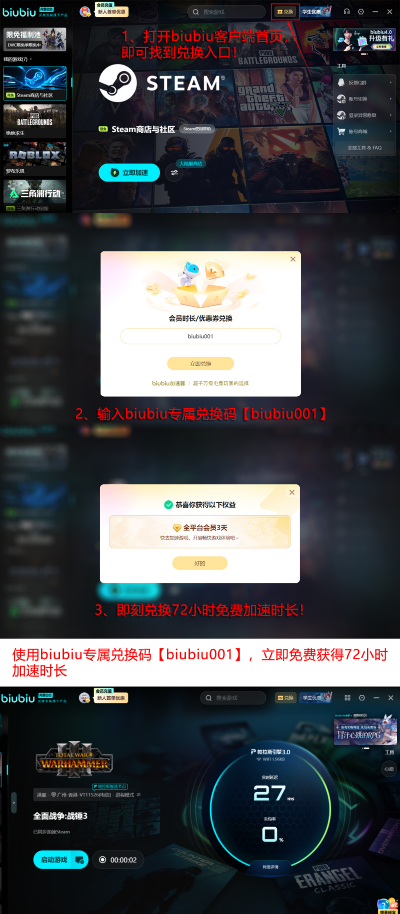 当前平台开放限时福利:所有用户复制兑换码【biubiu001】即可领取3天免费加速时长;新注册用户额外加赠24小时专属礼包。两项权益可叠加使用,最高可享96小时无门槛加速服务,全程零费用解决战役加载异常问题。