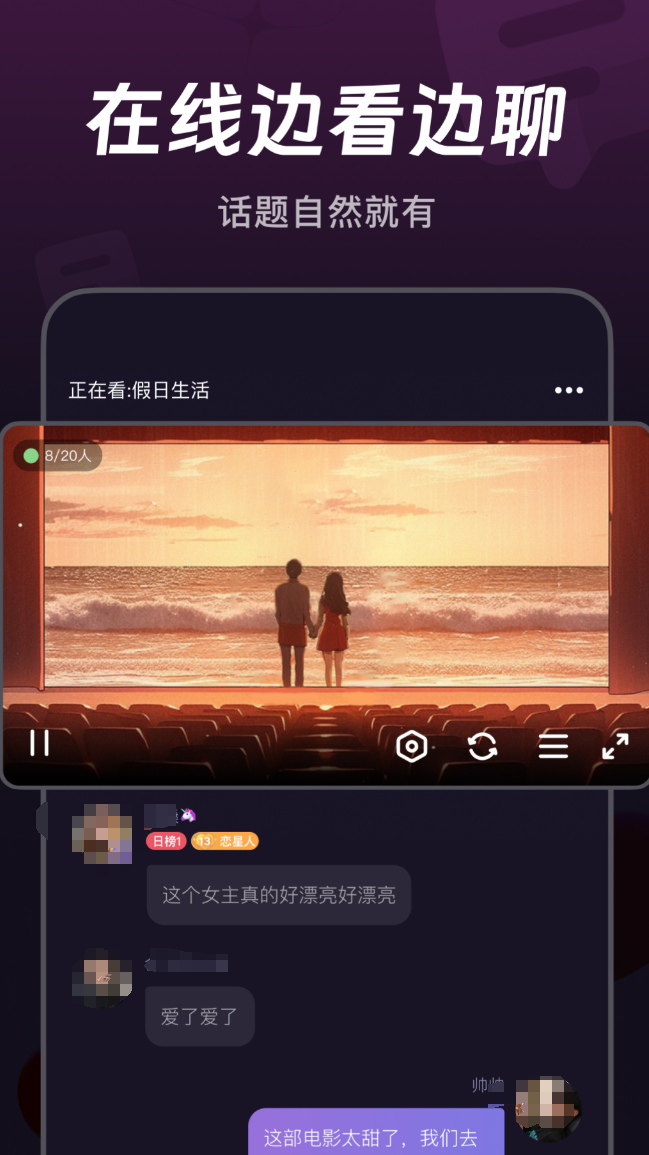 两个人一起看同一部片子,聊天就有了自然的切入点,不用绞尽脑汁想话题。房间可以设置成只有异性才能加入,也可以开放给所有人,灵活度不低。不想露脸的用户可以选蒙面闪聊,只用声音交流,压力小很多。动态广场可以发帖子找同频的人,游戏互动板块也有,玩着玩着就熟了。界面是深色系,没有开屏广告,看片的时候不会被打断。