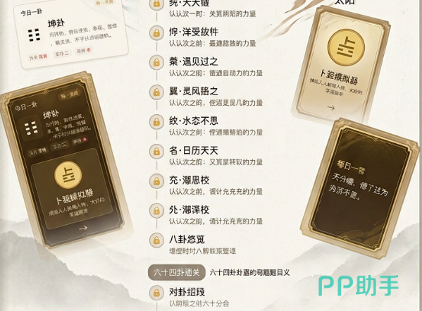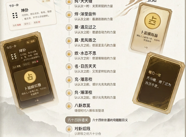 玩家可以通过简易的操作模拟每一次的卦象推演,其实对应的就是不一样的人生情境。所有的一切告诫都会在游戏中通过一种趣味的形式呈现出来,让玩家在娱乐中就能感受到为人处事的智慧。游戏还会专门设计101项成就系统,一旦在完成之后,就可以获得卜卦值。用来去解锁更多的卦象收藏,还有背景解读,每一项成就其实都会对应易经中的那些知识点,让玩家在闯关升级的同时就能够掌握这些传统的文化知识。