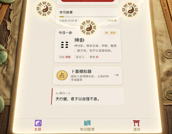 游戏还会优化进度存档的功能,玩家可以随时接续上一局的游戏进度,并不需要担心中途之后退出就会丢失进度。从视觉上来看,游戏主要是以简约雅致作为核心,将八卦符号融入到界面的设计中,色彩淡雅柔和。同时还会新增加每日卦象抽取功能,玩家可以在首页去抽取当日的卦象,在轻松互动中就能感受易经文化的趣味性。不需要刻意的钻研,就能收获一份温暖的启示,所以这样的一款游戏真的值得大家去关注。