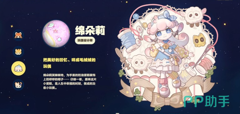 接下来为大家介绍的就是棉朵莉,棉朵莉外观制作上面看起来是非常治愈的一个绵羊拟人化角色,而且它整体的外观设定上面浅浅的粉色加上蓝色,看起来是非常温暖的一个人物,在游戏当中她出现的情况下一般都是会有一些需要大家去缝补衣物的任务,而且在游戏当中,棉朵莉如果出现的话,背景音乐上面也会附带一些铃铛的声音,因为她的脖子上面就挂着一个铃铛,经常出现的各种装饰道具都是自己制作的,比如一些背包,都是可以通过大家获取的材料,然后让棉朵莉为大家直接制作而成,后期大家从棉朵莉那里可以学到很多的装扮搭配,以及各种材料织物的材料制作配方哦。