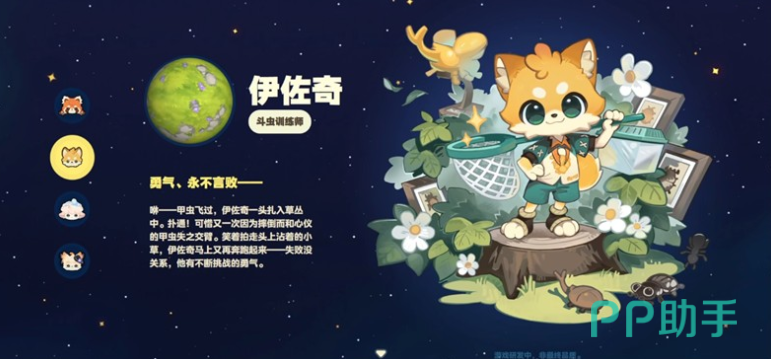 第二个为大家推荐的就是伊佐奇,伊佐奇目前在外观设定上面也是偏向于拟人化的动物,当然它在这里的话更像是一个浅黄色的狐狸,而且它的外观制作看起来是比云果更具萌感的,出现的时候,身上穿的是一套绿色的运动套装,而且在它的手上经常会拿着一个网子,这个网子就叫做捕虫网,所以后期大家参与探索玩法里面,只要解锁了捕虫模式的话,在这里就可以利用它告诉大家的各种技巧去参与野外捕虫,而且捕捉到的各种昆虫的呀,还可以参与斗虫,她的职业就是一个斗虫训练师,目前在整体的性格制作上面是比较乐观的,后期不管是捕捉什么样的昆虫,或者是后期想要针对不一样的豆虫进行培育的话,伊佐奇都是非常重要的一个NPC,它不仅会解锁很多的昆虫捕捉技巧分享给大家,后期还可以通过昆虫收集来解锁它那里的昆虫图鉴,参与一些多种比赛的话,大家也可以在它那里拿到很多的奖励。