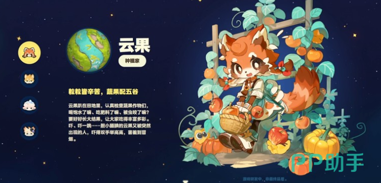 第一个为大家介绍的就是云果,云果目前在游戏当中是第一批就放出来的角色,她也是目前在外观设计上面非常受欢迎的一位狐狸角色,外观制作上面整体的色彩呈现的是橙色,而且拥有的拟人设定就是身穿女性的漂亮长裙,后期在移动的过程当中,大家还可以看到她充满灵动的尾巴在摇摇晃晃的动作,那么这类动物外观设定出来的角色其实是带有一部分人与动物相互交织的色彩,在游戏当中云果是属于一个比较胆小的人物,她比较擅长在种植领域当中参与各种不同植物的研究,而且作为一个种植家她其实后期对于大家解锁了种植园的时候带来的互动会更多一些,只要解锁了她更多的专属对话,后期在种植的一些小技巧上面,她也会为大家带来很多的细节,在这里如果大家后期大部分玩法里面是想要参与经营玩法的话,云果是其中非常重要的一个角色。