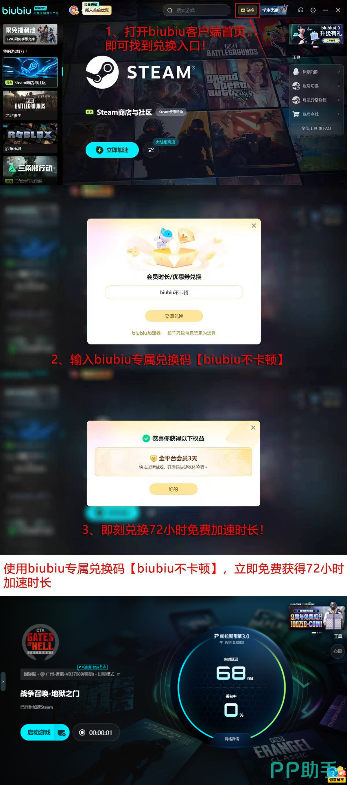 新用户注册后即可解锁首日24小时全功能体验权限;额外输入激活码【biubiu不卡顿】,可即时延长加速服务至72小时,累计享有96小时无限制使用周期。