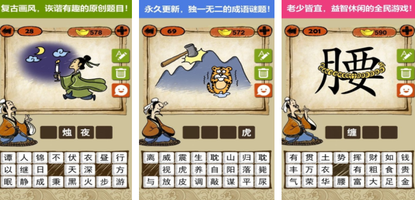众多益智休闲类游戏中,最受欢迎的要数猜词大作战,游戏没有复杂的画面设计,进入游戏之后,玩家将会开启竖屏关卡挑战,每一关都会用复古画面展现出一幅图画,玩家需要根据图画意思选择出正确的词语,每一关都会设定不同的谜题,不管是打发时间还是锻炼成语知识储备都可以,上百道关卡等待玩家来挑战,大量灰谐幽默的趣味题目,都能和熟悉的成语融合起来。