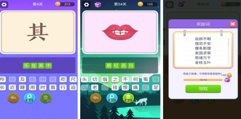 猜测词大师会设置大量有趣的图片,要根据每个图片表示的意思,选择出对应的汉字组成词语,回答正确之后,玩家会继续进入到下一关挑战,每一关的词语都会给出详细释义和解释,玩家可以通过不断猜测消磨时间,游戏里涵盖大量成语,适合打发空闲时间,每一关的图片设定都非常简洁,需要不断思考,选择出正确的汉字才能通关。