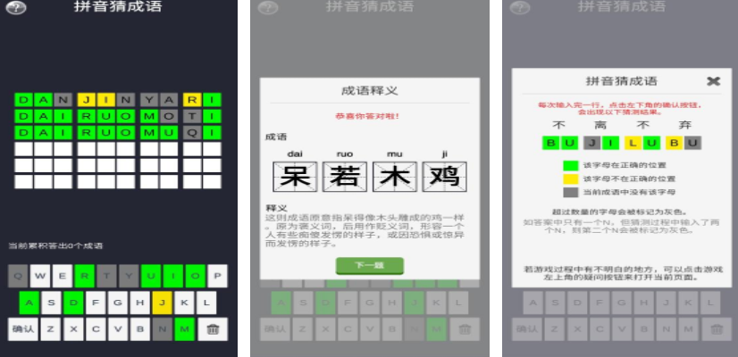 三四年级或者想要学习拼音和成语的玩家,都可以尝试拼音猜词语,挑战开启之后会给出大量打乱的拼音,玩家需要在游戏里不断调整复原拼音顺序,顺利拼写出来的成语,会给出正确拼音和相关出处释义,游戏没有时间限制,可以静下心来不断思考,挑战过程中会设定大量关卡,玩家可以通过一次挑战,提升自身的成语储备。