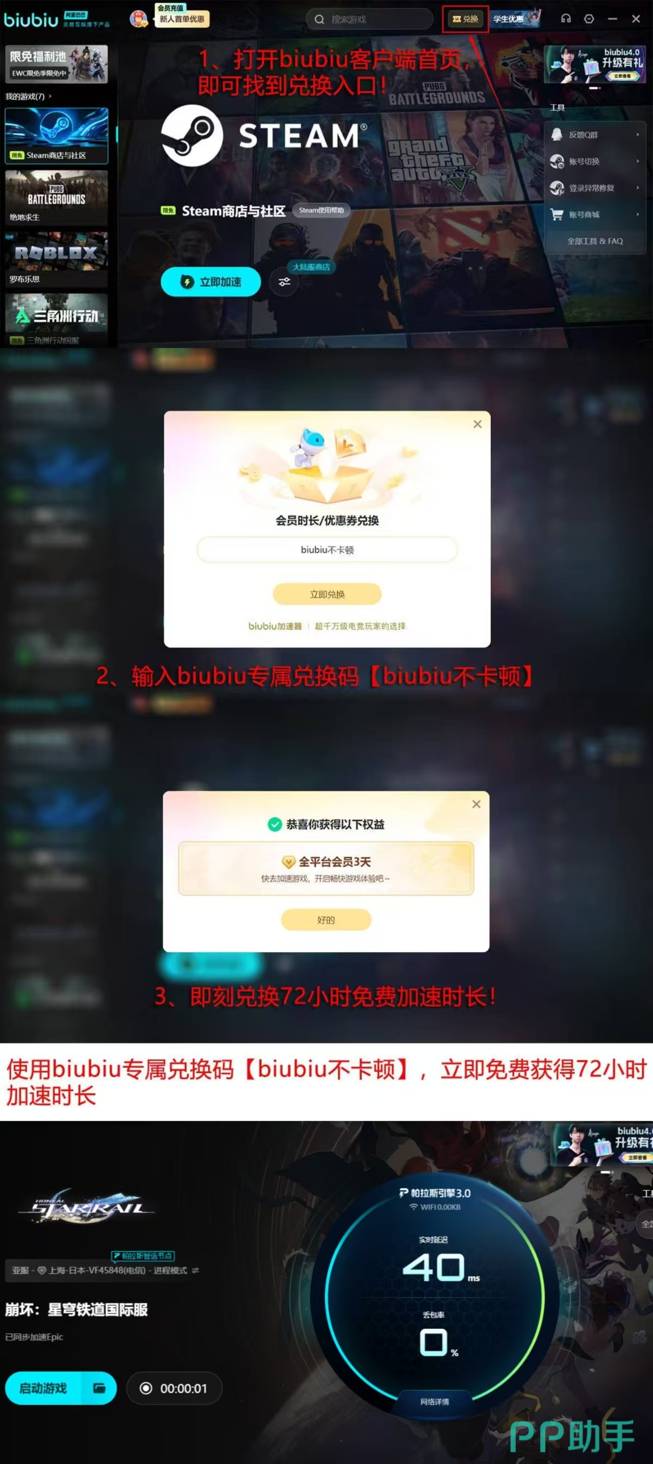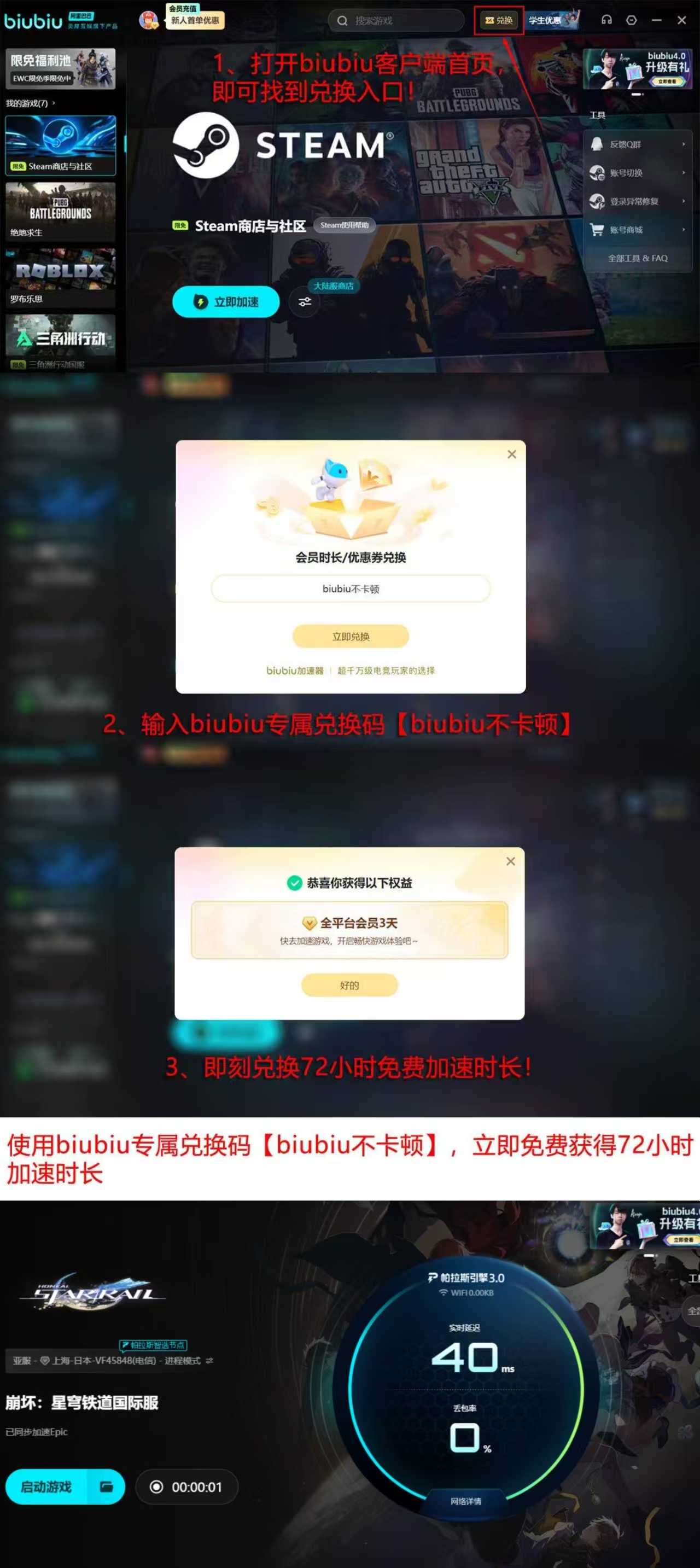 注册biubiu加速器账号即可获得24小时全功能免费试用权限,支持《崩坏:星穹铁道》全线路加速服务。新用户输入兑换码【biubiu不卡顿】,可额外领取72小时加速时长,累计享有96小时无限制体验。在此期间,玩家可全面验证其在不同网络环境(如4G/5G切换、Wi-Fi信号边缘区域)及多任务并行状态下的稳定性表现,切实评估对闪退率、加载速度与操作响应的改善效果。