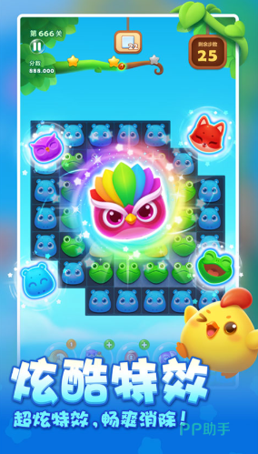 当前版本已更新至9000余关,采用藤蔓攀爬叙事框架,通关即推动角色向上进发,最终达成营救村长的核心剧情目标。消除逻辑支持横纵方向及L形、T形等多形态三连及以上组合,适配碎片化使用场景。美术风格细腻统一,融合动物救援、限时挑战等玩法模块,并同步节日主题限时活动,长期可玩性突出。