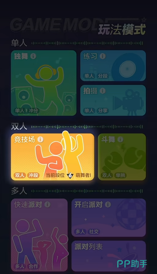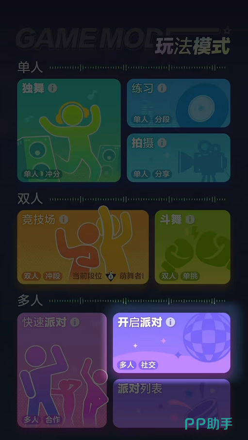 游戏主界面提供三大参与维度:单人、双人与多人模式。单人场景涵盖独舞挑战、自由练习及舞蹈拍摄功能;双人玩法聚焦竞技性,包括竞技场实时对抗与斗舞PK;多人模式则支持快速匹配、自主建房及浏览派对列表三种入口。若需深入掌握进阶策略与隐藏机制,推荐下载九游APP,该平台由阿里巴巴灵犀互娱运营,依托稳定技术架构与丰富运营资源,持续提供游戏专属礼包、节日限定福利及版本更新资讯,助力玩家高效获取成长资源。