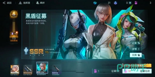 黑盾征募池为常驻开放卡池,保底规则为70抽必出SSR角色。此外,系统会定期发放免费单抽机会,降低基础参与门槛。值得注意的是,角色卡池内存在模块掉落机制:抽取SSR时仅限角色本体;而SR与R品质卡牌则可能附带模块或武器类道具。若玩家专注强化装备体系,可进入独立武器池进行定向抽取,该池保底规则与角色池一致,均为70抽必得SSR武器。