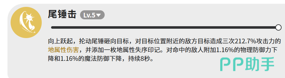 技能体系由三式构成:尾锤击、岩锥、铁球冲撞。其中尾锤击为核心爆发技,拥有全技能最高释放优先级。施展时铁球蜥跃起并以尾部铁球进行范围砸击,覆盖目标及其周边区域,共触发三段独立伤害,每段倍率为212.7%攻击力,总倍率超600%,在同阶幼年星灵中属顶尖水准。该技能附带双重战术效果:一是施加“地属性失序印记”,二是使命中目标物理防御与魔法防御各降低1.16%,持续8秒。此减防效果可叠加至多名敌人,显著提升后续队友的输出转化效率,兼具伤害与功能性,应作为起手技优先使用。