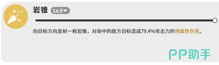 岩锥为直线投射型技能,向指定方向发射一枚岩质尖刺,命中后造成79.4%攻击力的地属性伤害。虽单次倍率中等,但具有低前摇、易命中的特性,是尾锤击冷却期间维持输出节奏与压制强度的理想补充手段,适用于衔接空档、稳定补刀及应对单体目标。