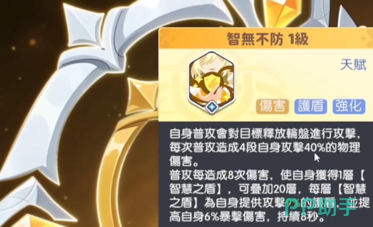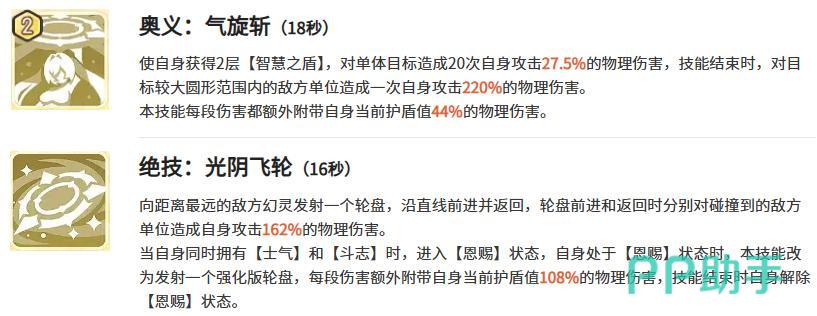 特技效果在进入恩赐状态后激活,使普攻段数增加、每段基础伤害提升;神格系统则进一步放大光阴飞轮与气旋斩所附带的护盾伤害倍率。值得注意的是,奥义释放本身亦可额外获取智慧之盾层数,而光阴飞轮每次命中敌人都将缩短奥义冷却时间。