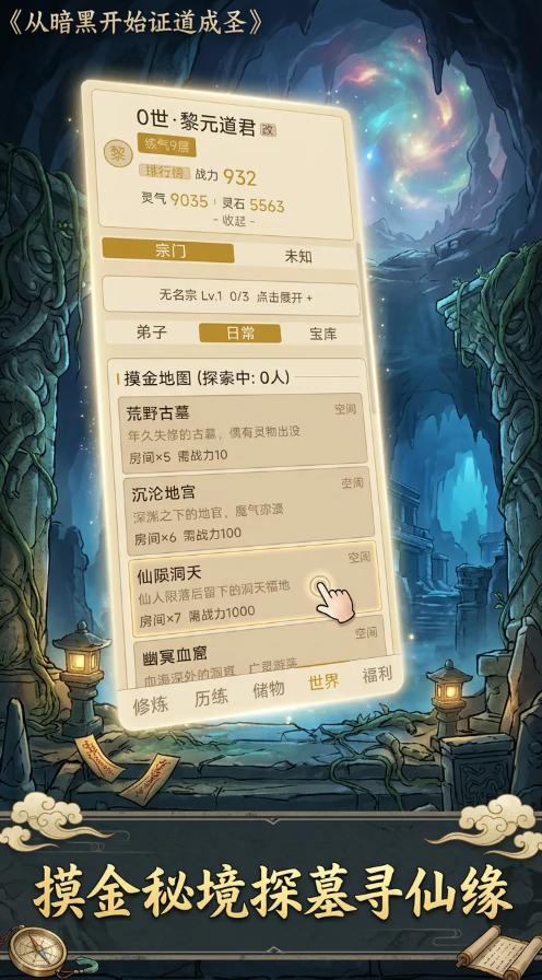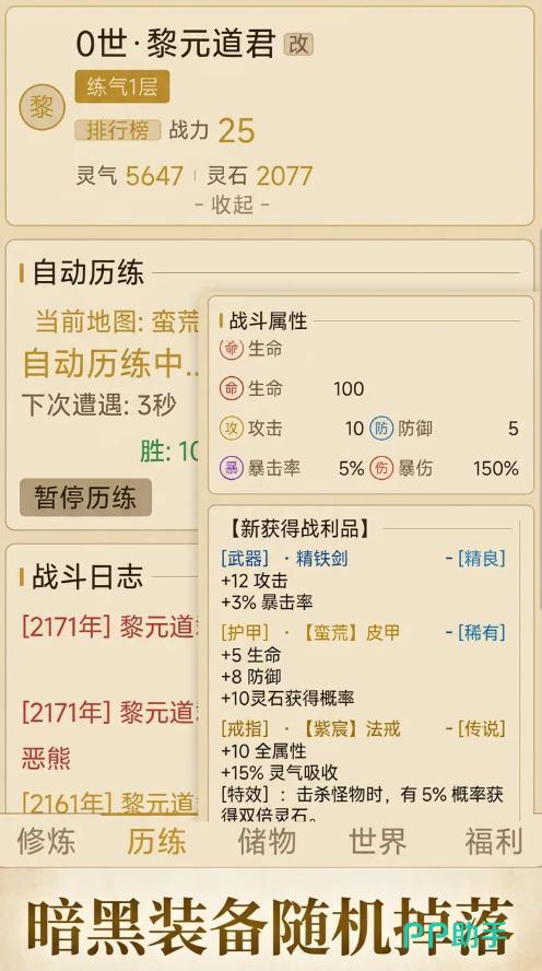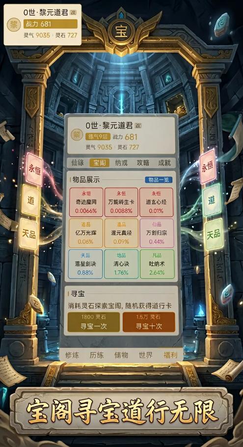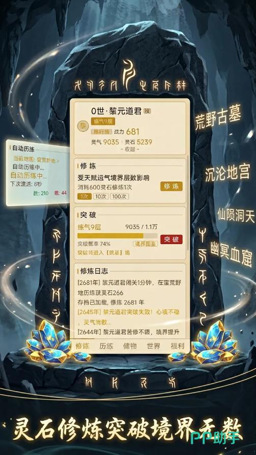 玩家初始身份为凡俗修士,通过持续投入灵石触发自动修炼进程,逐步积攒灵气与修为值。当修为达到当前境界阈值后,即可发起突破,依次经历练气、筑基、金丹、元婴、化神、渡劫等传统修真阶段,最终目标为成就大罗金仙之位。每次突破不仅解锁新功能模块,更带来基础属性加成与战力质变,形成清晰可感的成长曲线。