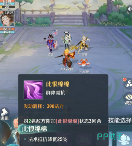 情尽恨生这是第2个技能,也是一个控场的技能,同样是消耗398法力,针对单个敌方单位会生效,可以让对方法术命中率降低20%。持续时间同样也是三个回合,面对敌方擅长控制或者是高命中的输出单位时,这个技能就可以完美地限制发挥。让我方控场神兽的技能可以更容易命中,同时还可以有效降低我方被敌方法术攻击的概率。除了核心的减抗控场技能之外,妃子还会具备实用的单体法术攻击能力,在关键的时刻就可以补伤害。