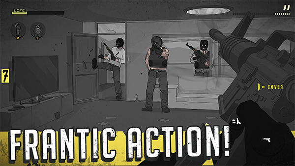 采用了站桩射击的方式,所以玩家是无法自行移动角色进行射击和对战操作的。屏幕上方的不同按代表着瞄准和攻击的动作,在战术和精准射击的配合之下,还是能够完成营救人质或者是拆除炸弹任务的,所有的任务都具有一定的导向性,使玩家可以全力的参与到反恐任务之中。