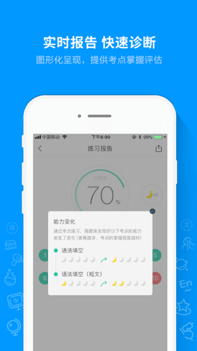 做错的题目不会就这么过去,系统会自动记录下来,按知识点分类整理,还会标注错在哪里、正确解法是什么。错题锁屏功能可以利用碎片时间反复练习,不用专门腾出大段时间。题目按年级和教材版本分得很细,学完三年级上册某个课时,直接找对应练习就行,口算、竖式运算、实际问题都有,难度贴近课本。做题报告用图形化方式呈现,知识点掌握情况一目了然,弱项会有针对性练习推送。