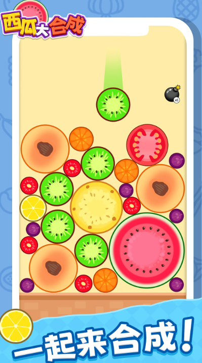 用手指滑动屏幕,把一样的水果放到一起,完成组合后会生成体积更大的水果,持续进行这种操作,最终可以合成出完整的西瓜。玩家进行游戏的时候,只需要完成移动与组合的动作,过程中需要思考水果摆放的位置,还要规划场内空间的使用方式,会逐步推进内容。后续场内可以使用的空间会变少,玩家需要在有限的条件下完成更多的组合操作。