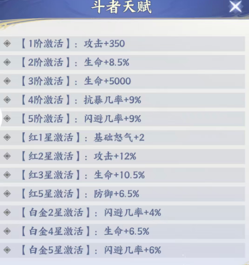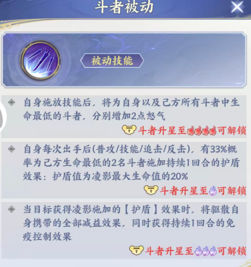 另外他在被动技能效果上面是在自身释放了技能之后可以触发的,此时他可以自己以及还有己方的一名队友都带来两点怒气的回复,这里所有斗者当中,只有生命数值最低的那个队友可以获得这里增加的两点怒气,而且他在每一次出手伤害敌人之后,不管使用的是普攻还是技能类型的输出,包括就算触发的是反击或者是追击,这里都有33%的概率,可以给我方生命最低的两名斗者带来持续一个回合的护盾防御效果,这里护盾的数值是根据凌影的生命数值来计算的,只能提取的在生命数值当中20%的数量来作为护盾进行防御,当然这个防御效果如果大家覆盖到我方的前排角色绝对是最实用的,当这类目标获取灵带来的获得能力时,他也可以驱散自己身上携带的所有减益,所以大家也可以当做一个专门用来解控的技能使用,同时这个目标身上同时还可以获取一个混合的免疫控制,所以如果放在我方前排身上的话,可以让队伍整体的生存能力变得更加强大一些,而在天赋能力上面,大家如果想为他带来攻击、生命还有各种暴击基础提升的话,他在不同阶级提升起来的百分比是非常高的。