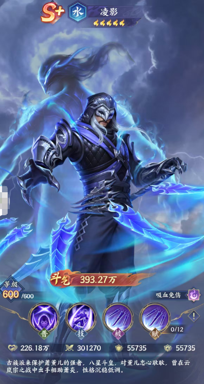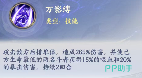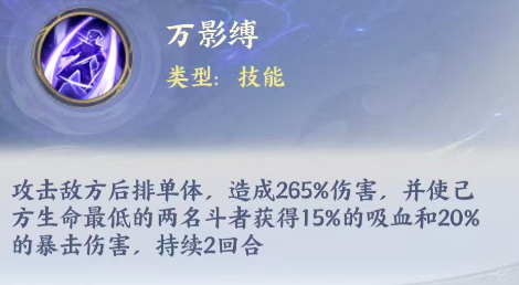 凌影使用的武器目前是更适合匕首的技能,效果当中如果给他使用瞬杀之类普攻的话,是针对敌方的后排进行输出,而且他一次性针对敌方的后排可以造成的是单攻,那么造成的百分百伤害,只要他自身的基础属性当中攻击数值非常高,这里能够造成的普攻伤害也就非常高,而他另外更好用的技能当中,有一个万影缚的技能,这个技能有束缚能力,技能当中他也针对性的带来了一个自身的优势,就是吸血的功能,使用这个技能的时候,凌影都会攻击敌方的后排,当然也是针对单体角色进行攻击,造成的伤害数值有265%之后,他可以使己方目前生命最低的两名队友身上获取15%的吸血,这里吸血是吸到对面的血量到我方队友身上来,然后另外还有20%的暴击伤害也可以得到加成,所以此时他给我方队友带来的增益能力绝对是不弱的,这个吸血的能力都要在这前两个回合当中是生效的话,我方其他血量比较低的敌人也不用担心自身的生存,包括在辅助角色的恢复效果上面压力也就没有那么大。