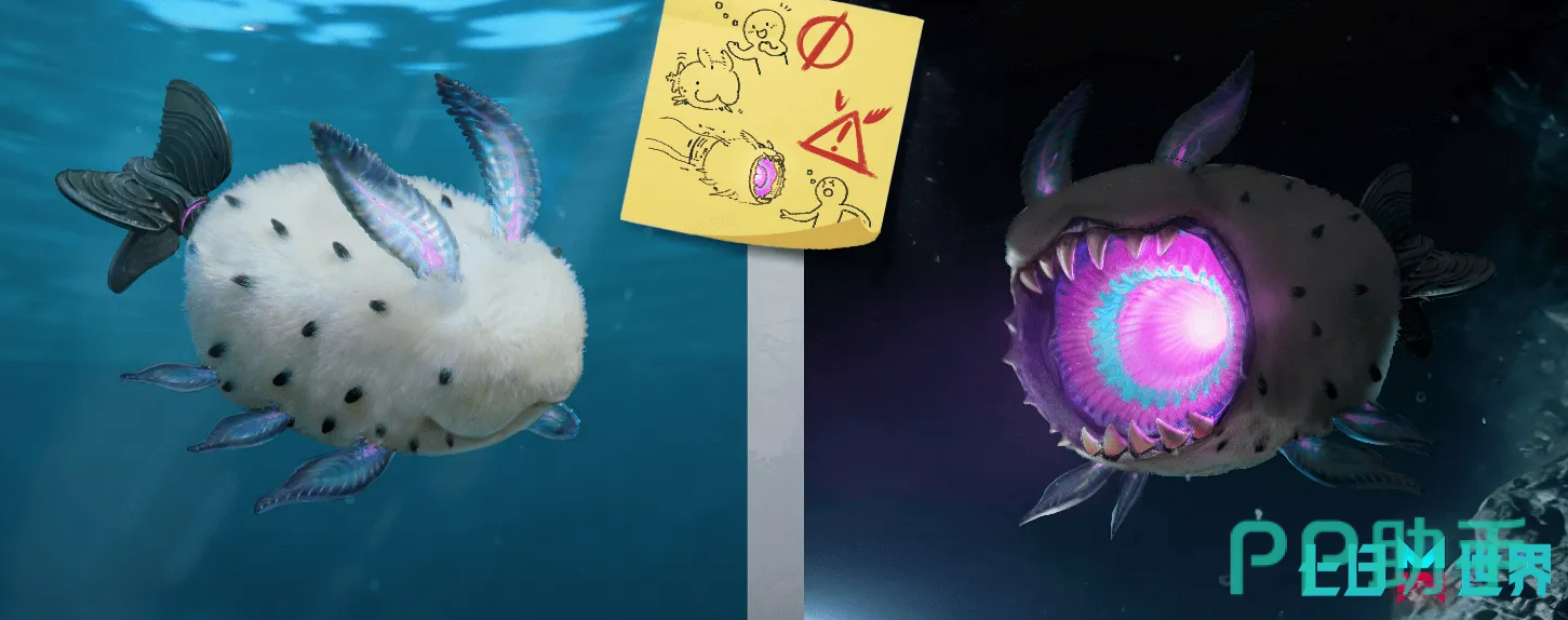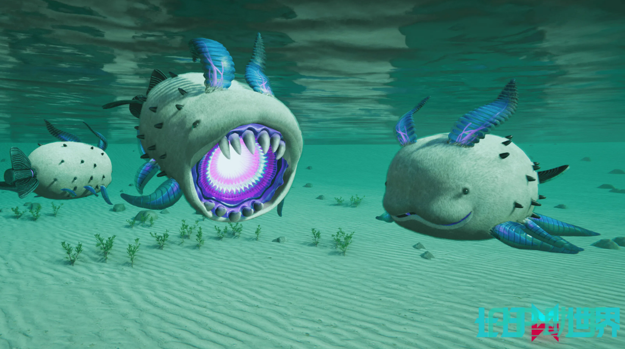 第二种新怪物是海兔。这个名字听起来挺可爱的,外形也确实有点萌。它的身体是猕猴桃那种形状,颜色灰白,长了三对鳍用来游泳,头上有两个像兔耳朵一样的突起,嘴巴是兔唇的样子。尾巴那里比较特别,原本应该是生物结构的部分,已经完全变成了螺旋桨形状的器官。