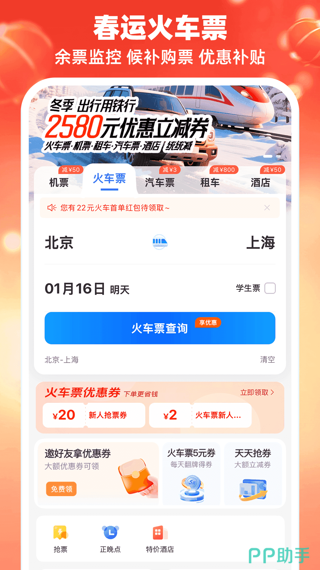 买票是最基础的核心功能,除此之外还能查询检票口、火车正晚点、候车室等等信息,安心等待出行就够了。不仅可以候补,还支持自动抢票,放假的时候也不用守着手机刷票,当然优惠福利也不少,经常有立减、满减的活动,价格划算不说,实用也不复杂。