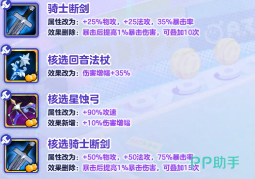 骑士断剑的改动幅度比较大,属性变成25%物攻、25%法攻、35%暴击率,但是原来那个暴击后叠加暴击伤害的效果被删掉了。核选版本属性翻倍,物攻法攻各50%,暴击率75%,叠加效果同样删除。删掉叠加效果之后,这件装备的上限可能会低一些,但基础属性还是挺扎实的。