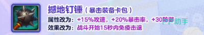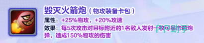先说新增的装备。这次加入了一个叫毁灭火箭炮的物攻装备,属于物攻装备卡包里的。它的属性是加25%物攻和20%攻速,效果是每打5次就会对目标附近的一个敌人发射一枚炮弹,这枚炮弹是可以暴击的,伤害是150%物攻。听起来挺有意思的,打出去的感觉应该很爽。核选版本的毁灭火箭炮更猛,物攻直接涨到50%,攻速40%,而且触发条件从5次降到了3次,输出频率高了不少。