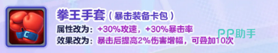 拳王手套这次改动也比较大。原来的属性换掉了,现在是30%攻速加30%暴击率,效果变成暴击之后提升2%伤害增幅,最多叠10层。核选版本翻倍,攻速和暴击率都是60%,叠加的伤害增幅也变成4%。这套装备走的是暴击流路线,如果队伍里有暴击相关的羁绊,搭配起来应该不错。