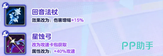 羁绊这边也有调整。回音法杖的效果改成伤害增幅加15%,核选版本是35%。星蚀弓改到攻速卡包里获取了,属性变成40%攻速,核选版本直接给到90%攻速,还额外加了10%伤害增幅,这个改动对攻速流来说算是个好消息。